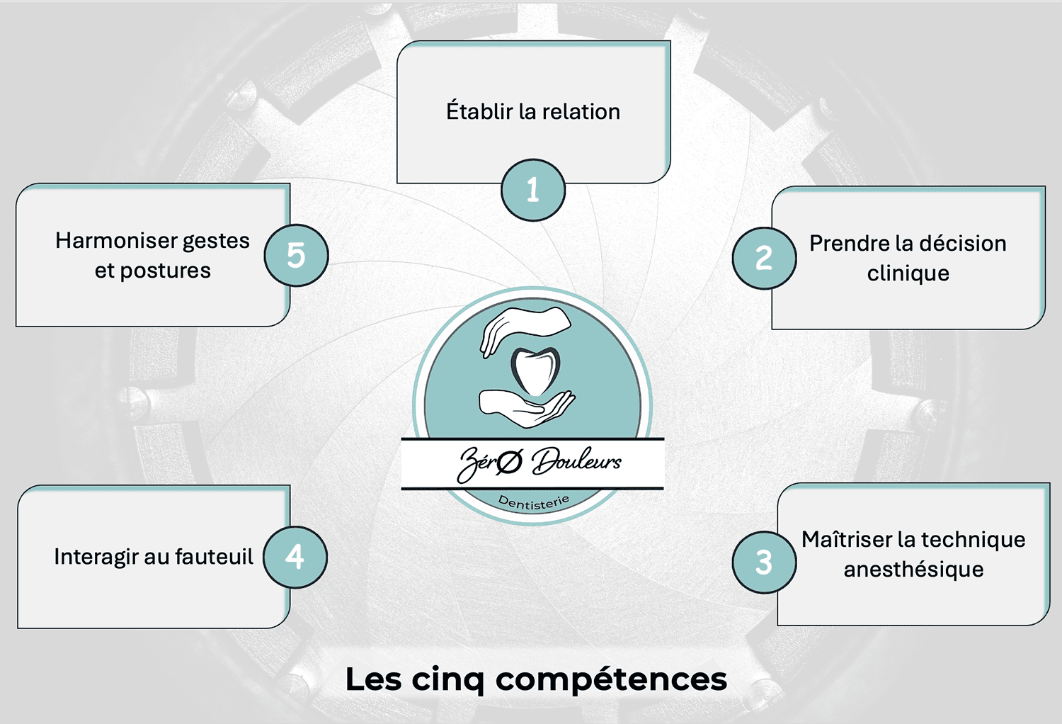 "Soigner sans douleur, c’est d’abord une manière d’être. Parce ​que l'expertise dans un seul domaine, une seule technique, n'est pas suffisante pour contrôler la douleur au cabinet dentaire, nous avons besoin de compétences multiples, regroupées en cinq compétences-clé."